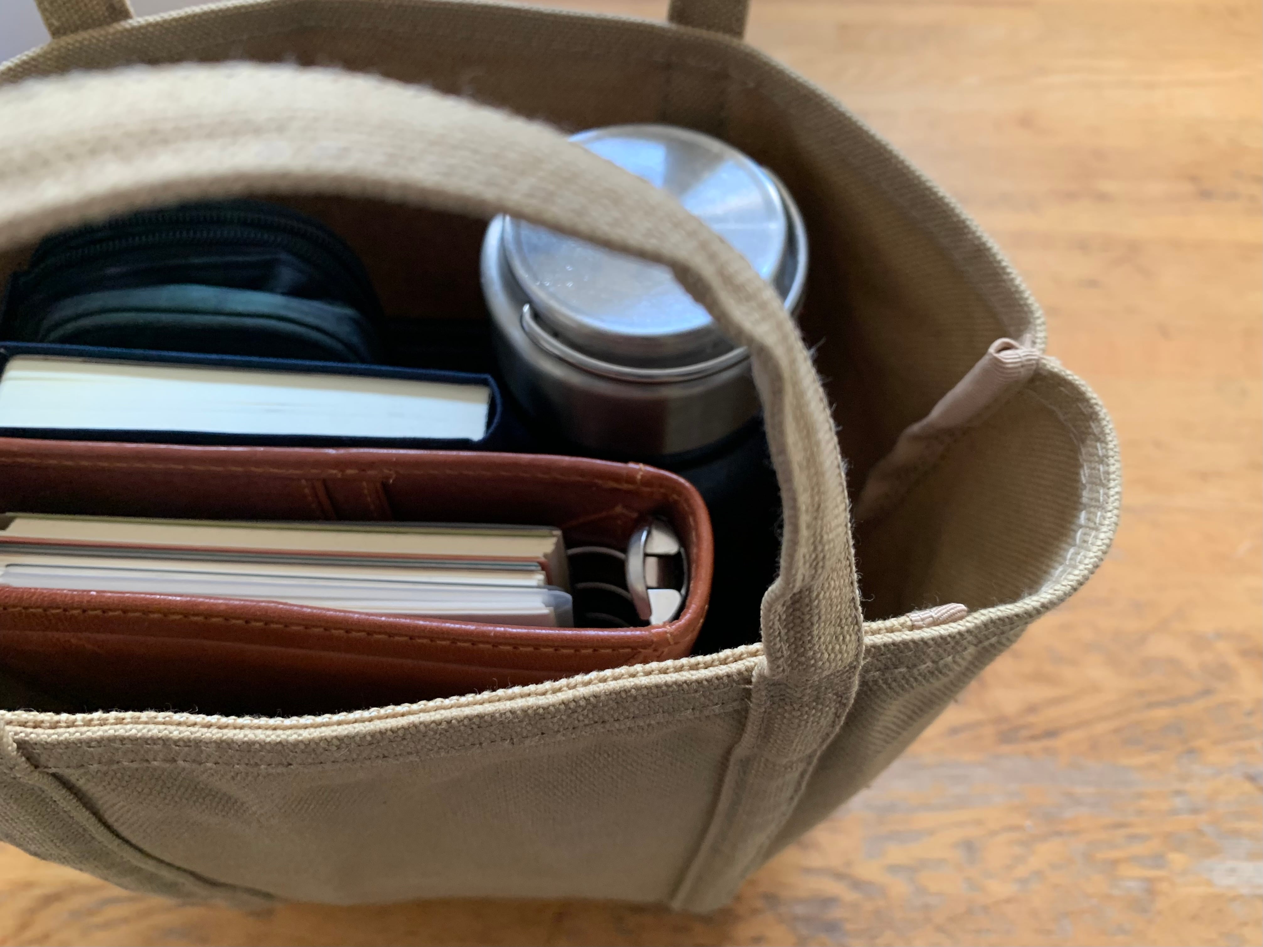小さなトートバッグはお散歩やちょっとそこまで・・・のお買い物などに便利です。